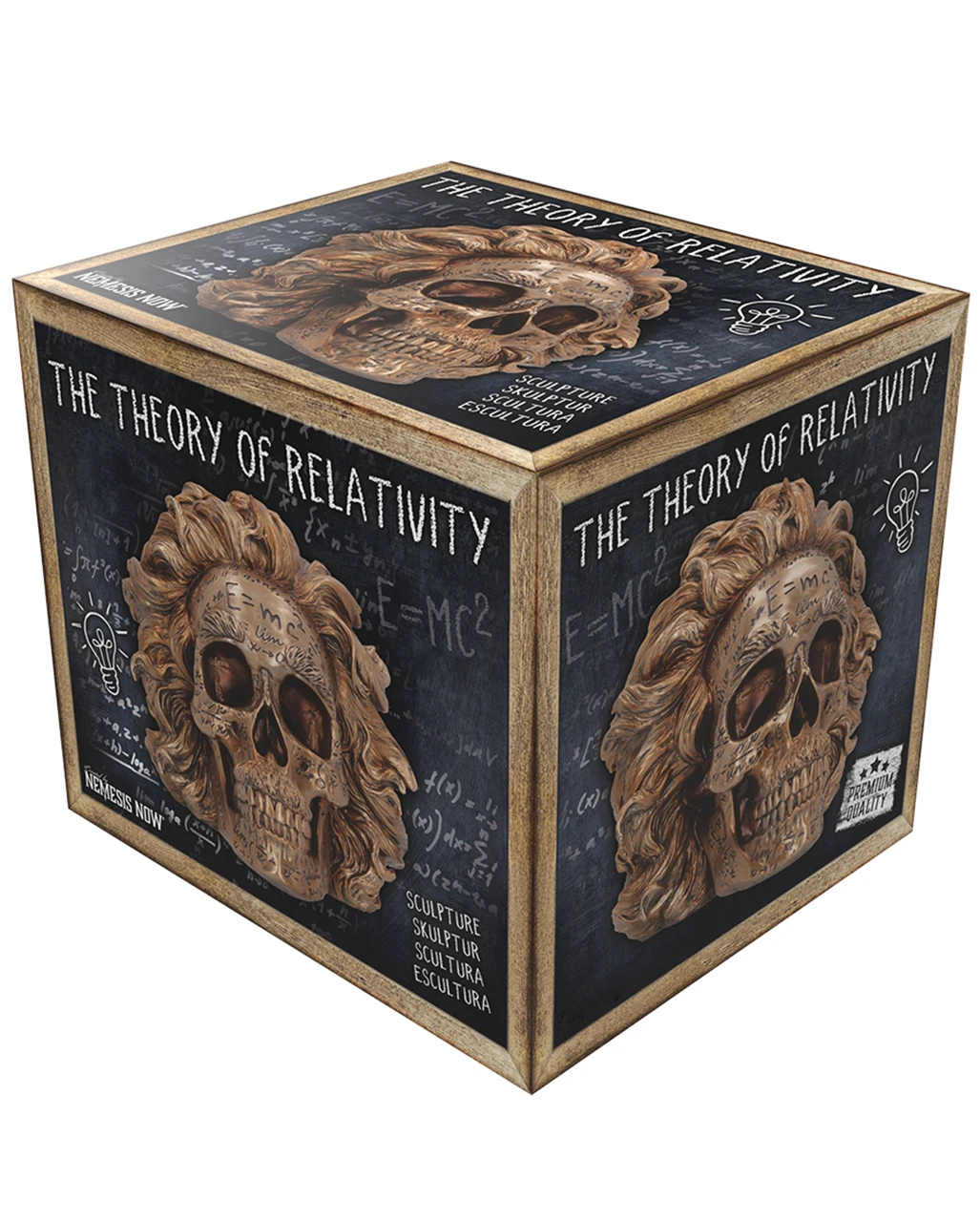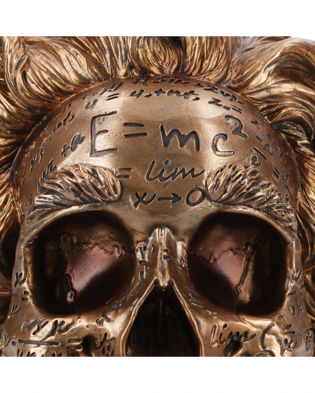 Der ungezähmten Fantasie eines chaotischen Künstlers entspringt dieser Schädel mit der Relativitätstheorie. Inspiriert von der Ikone der theoretischen Physik, Albert Einstein, ist dieser bronzefarbene Schädel mit mathematischen Gleichungen bedeckt und hat einen dicken Kopf mit wild aussehendem Haar.
