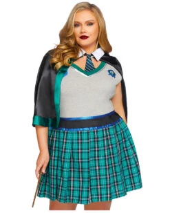 Trotzdem kann es nicht schaden, wenn du den Zauberstab Hermine Granger passend zu deinem Böse Zauberschülerin Kostüm erwirbst. Das Kostüm-Set selbst besteht aus einem sexy Kleid mit grün kariertem Rock, der sehr kurz ist. Das Plus Size Kostüm betont deine Kurven durch das enge Oberteil und den V-Ausschnitt besonders gut. Auf der Brust prangt das Wappen deiner Zauberschule, wahrscheinlich ein Konkurrent von Hogwarts. Weiterhin gehört zu der Schulmädchen Verkleidung auch noch das zauberhafte grün-schwarze Cape und die kleine Krawatte.