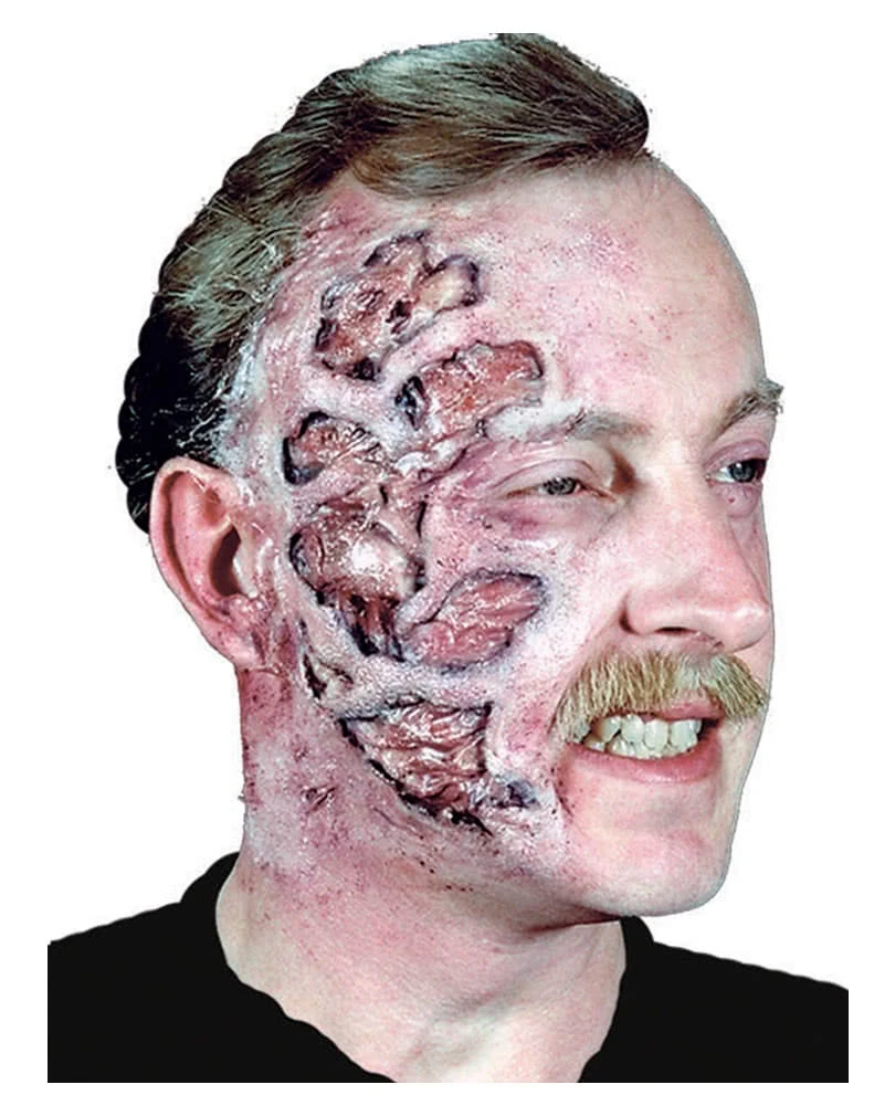 3D Burn! Säureangriff, krasser Sonnenbrand oder Wunde eines Brandopfers mit aufgeplatzten Brandblasen über das halbe Gesicht! Mit der Brandopfer Latexwunde als Spezial Make-up Zubehör lassen sich eine extrem realistische Brandwunde schminken, die vollkommen die linke Gesichtshälfte bedeckt. Mit der großen Latexapplikation als Spezial Make-up schminkst du dich professionell als Phantom der Oper oder Freddy Krüger.