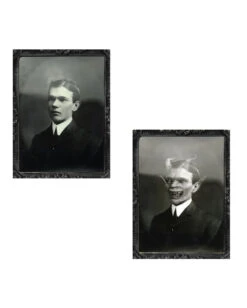 Das Effektbild Dämon ist ein typisches Wackelbild und zeigt entweder einen Jungen Mann mit Seitenscheitel oder eine gruselige Dämon Fratze mit Hörnern und sitzen Ohren und Zähnen. Das Wechselbild ist in schwarz und weiß gehalten und hat einen Rahmen mit einer verschnörkelten Bordüre. Alternativ haben wir auch noch das Effektbild Portrait Mutter mit Baby und das Hologramm Portrait „Großmutter“.