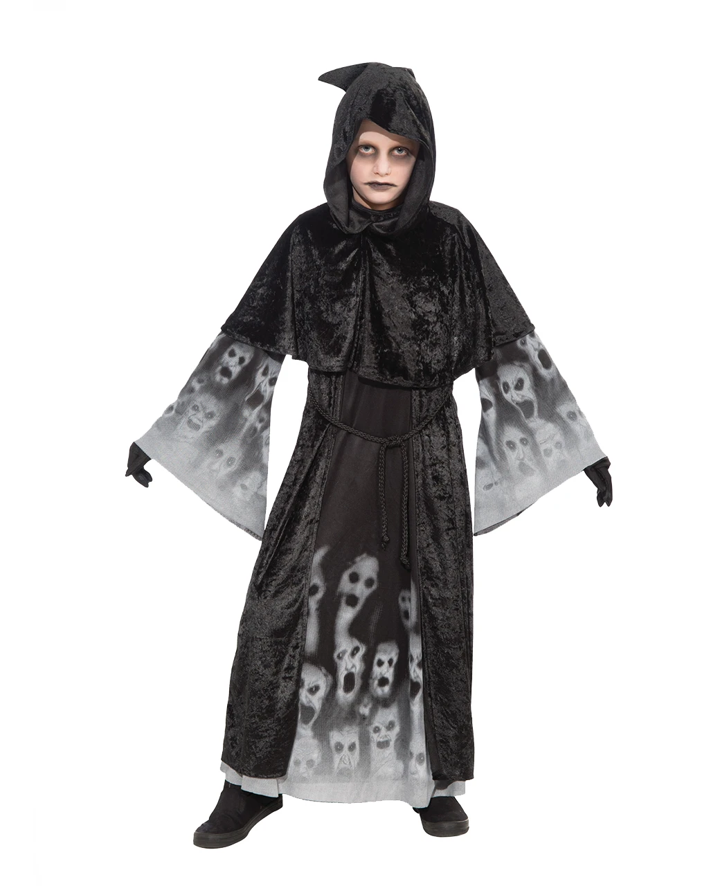 Happy Gruselnacht! Im Forgotten Souls Kinderkostüm habt ihr das Outfit eines unheimlichen Seelenfängers, der ein Profi im Herumspuken ist. Und das Beste an diesem Halloween Kinderkostüm: Du musst nicht frieren. Darunter kann man schließlich noch Strumpfhose, Leggings oder Hose und Pullover anziehen. Der Umhang mit dem Kapuzen Cape in tiefem Schwarz verbirgt alles. Zu Erkennen sind nur die verzweifelten Gesicher der gepeinigten Seelen, die an den weiten Ärmeln und in Hähe der Beine zu sehen sind. Schminkt euch passend dazu mit dem Spooky Geister Make-up Set.