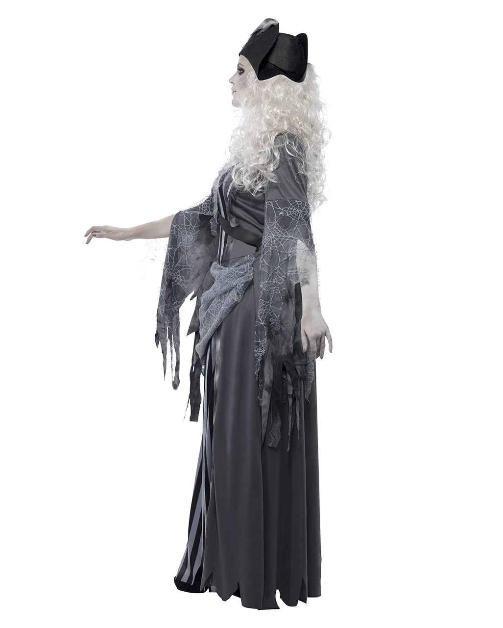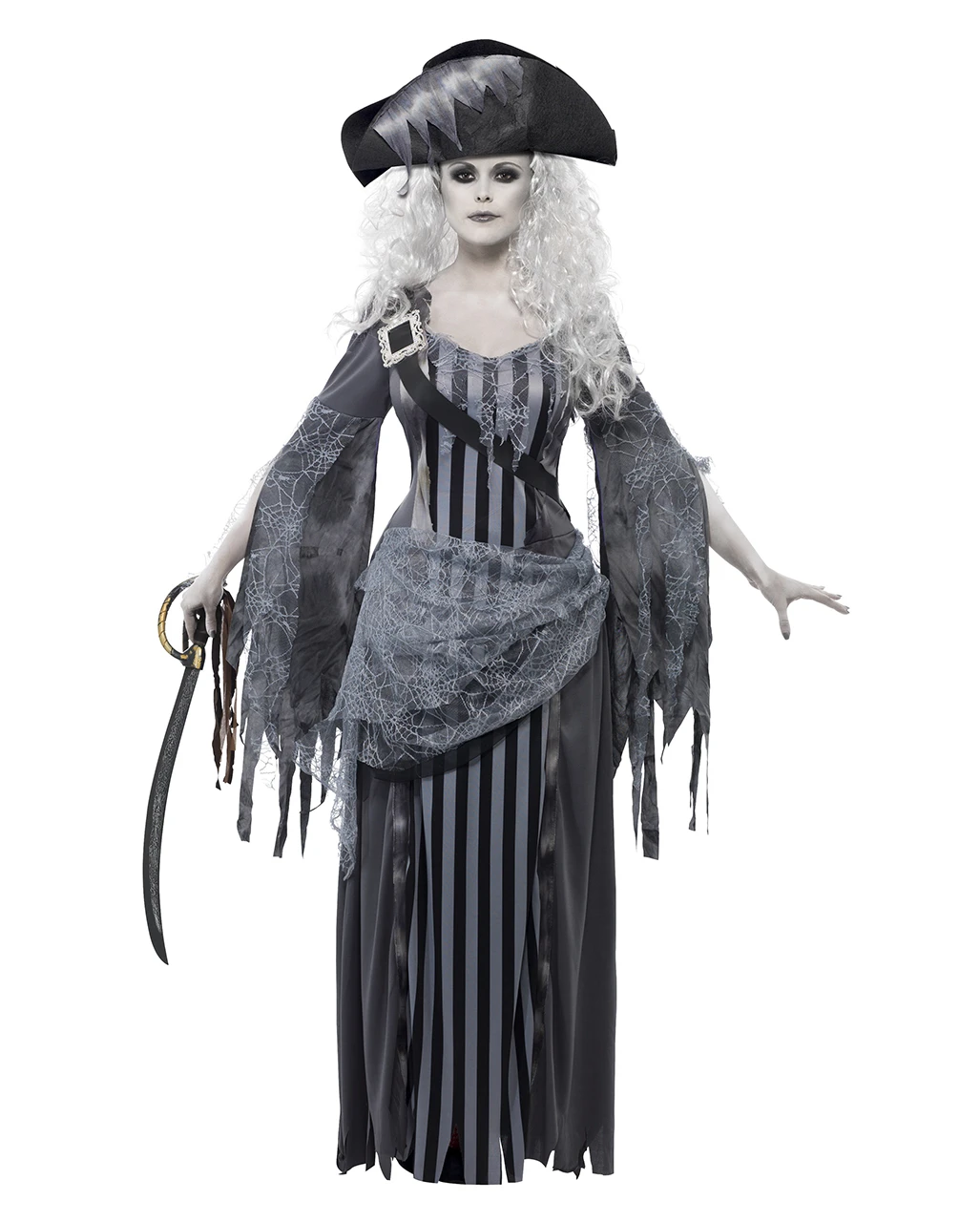 Das Geisterschiff Prinzessin Kostüm besteht aus einem einem Kleid und einem Hut. Das Kleid ist aus dunkelgrauem Stoff und angenähten Stücken Gaze-Stoff mit Spinnwebenmuster. Vorne hat das Kleid schwarze und graue Längsstreifen. An der Hüfte ist ein Tuch mit dem Spinnwebenmuster angebracht. Die Ärmel ab dem Ellenbogen aufgeschlitzt und hängen lang herunter. Schräg über die Brust verläuft ein schwarzer Gürtel. Der fast bodenlange Rock hat unten einen gezackten Saum. Der Hut ist aus schwarzem Stoff und hat vorne ein Stück dreieckig gezackten grauen Stoff angenäht. Du brauchst nur noch eine Piraten Pistole, ein Piratensäbel als Piratenschwert lang 70cm und die Zombie Queen Perücke, um den Rest der Ewigkeit auf Kaperfahrt zu gehen.