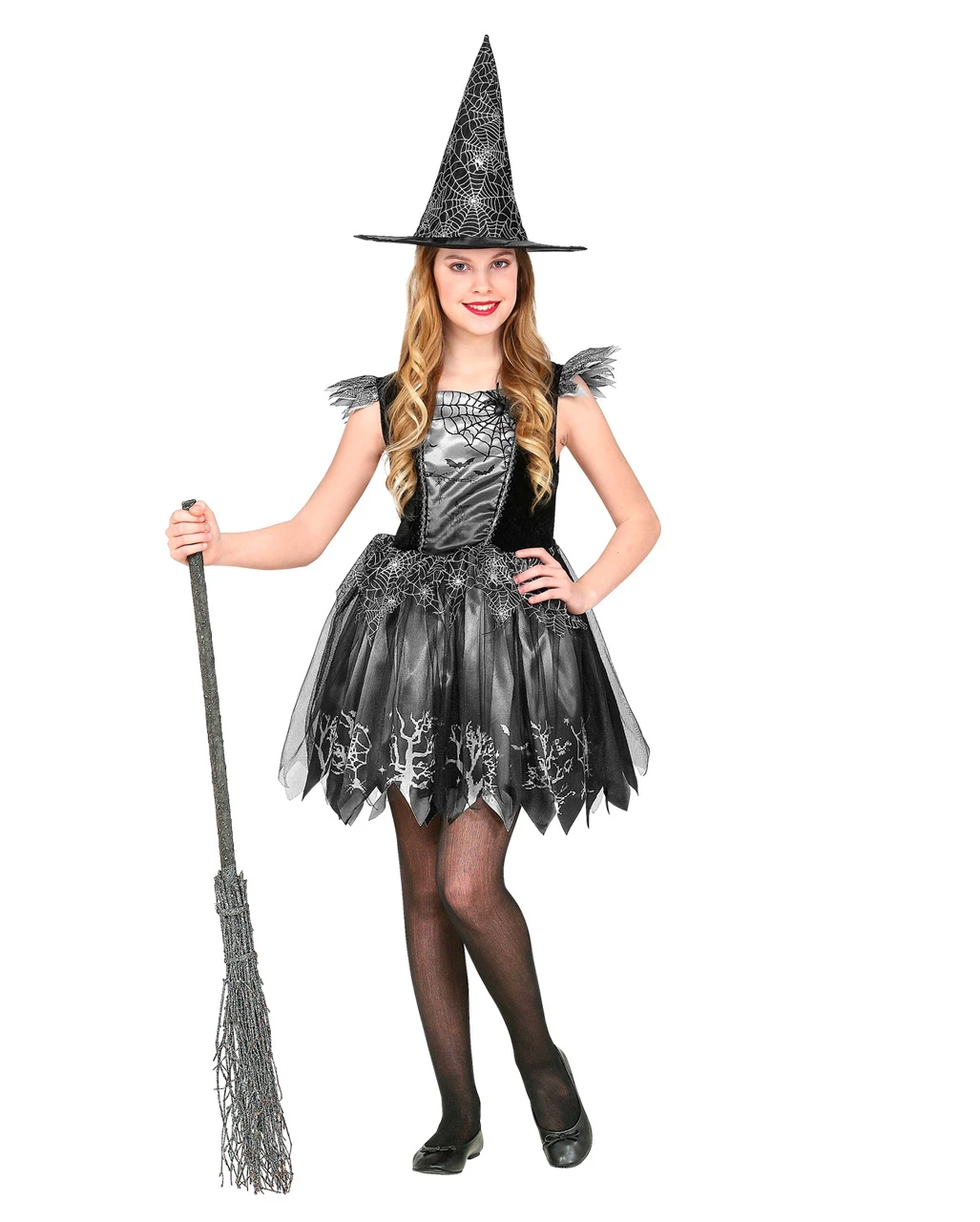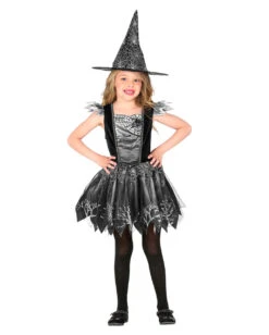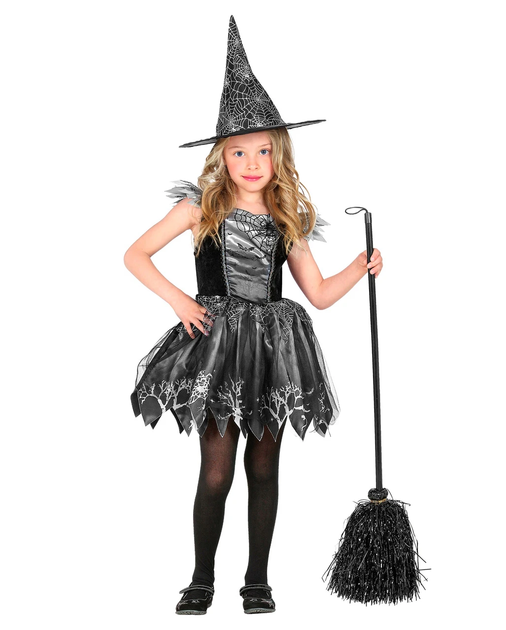 Unser glänzendes Spinnenhexe Kinderkostüm kommt im mystischen Scharz-Silber-Look daher und besteht aus mehreren Lagen. Da ein Tüllrock im Kostüm verarbeitet ist, erhält der Rockteil etwas mehr Volumen und Luftigkeit. Unser Hexen Kinderkostüm verfügt über kurze Ärmel. Bei kaltem Wetter solltest du deshalb ein Langarmshirt darunter ziehen. Der Hexenhut mit Spinnweben-Motiv ist ebenfalls ein Teil des Kostüms. UnserHexen-Besen klein ca. 87 cm ergänzt das Kostüm ideal.