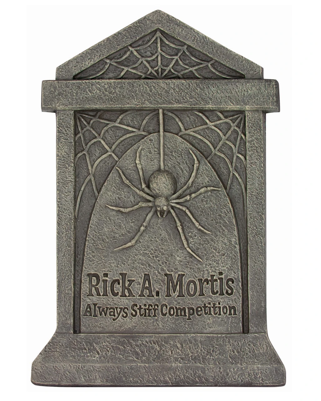 Der Grabstein mit Spinnennetz & Spinne enthält neben dem fiesen Krabbeltier auch eine Inschrift: „Rick A. Mortis – Always Stiff Competition“. Die beigefarbenen Highlights verleihen dem künstlichen Grabstein den Anschein von Textur und Verwitterung. Mit ein wenig Grünes Deko Moos 80g und Halloween Spinnennetz weiß 40gr. dekoriert fügt sich der Halloween Grabstein wunderbar in die restliche Friedhofsdeko ein.