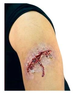 Die Latexapplikation wird mit Mastix Hautkleber oder Flüssiglatex auf die vorher gereinigte Stelle geklebt. Die Ränder und übergänge lassen sich mit Flüssiglatex und Make-up kaschieren. Jetzt noch etwas Filmblut und schon besitzt du eine fantastisch aussehende Sicherheitsnadel Wunde als realistische Unfalldarstellung. Die Latexwunde lässt sich immer wieder verwenden.Mastix Hautkleber klein , Hautfarben Make Up Kit / Flesh Stack und Spezial FX Blut Gel nicht inkl.