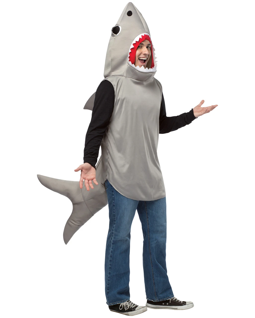 Das Hai Kostüm ist natürlich auch ein genial witziges Kostüm für den Fasching. Schließlich bist du in der Hai Verkleidung ein echter Eyecatcher. Du siehst aus wie die furchterregendste Kreatur im Meer und bist doch ein gern gesehener Gast auf der Motto Party. Die hellgraue Polyschaum Tunika hat eine Rückenflosse auf der Rückseite und eine Schwanzflosse an der Unterseite. Dein Gesicht ist in der Mundöffnung mit weißen gezackten Zähnen umrandet. Damit hast du alles im Blick.