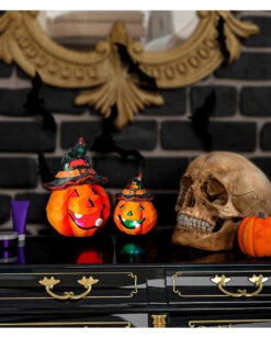 Unser leuchtender Kürbis besteht aus Keramik und ist etwa 12 x 9 cm groß. Die LED Halloween Deko wird mit Batterien betrieben, die in der Lieferung enthalten sind. Sobald der Pumpkin eingeschaltet ist, beginnt das bunte Farbenspiel, das sehr faszinierend wirkt. Auf dem Fensterbrett und am Halloween Buffet kommt unser LED Jack o Lantern ideal zur Geltung! Entdecke noch mehr fantastische Gruseldeko mit LED wie unseren Halloween Totenkopf Türkranz mit LED Augen