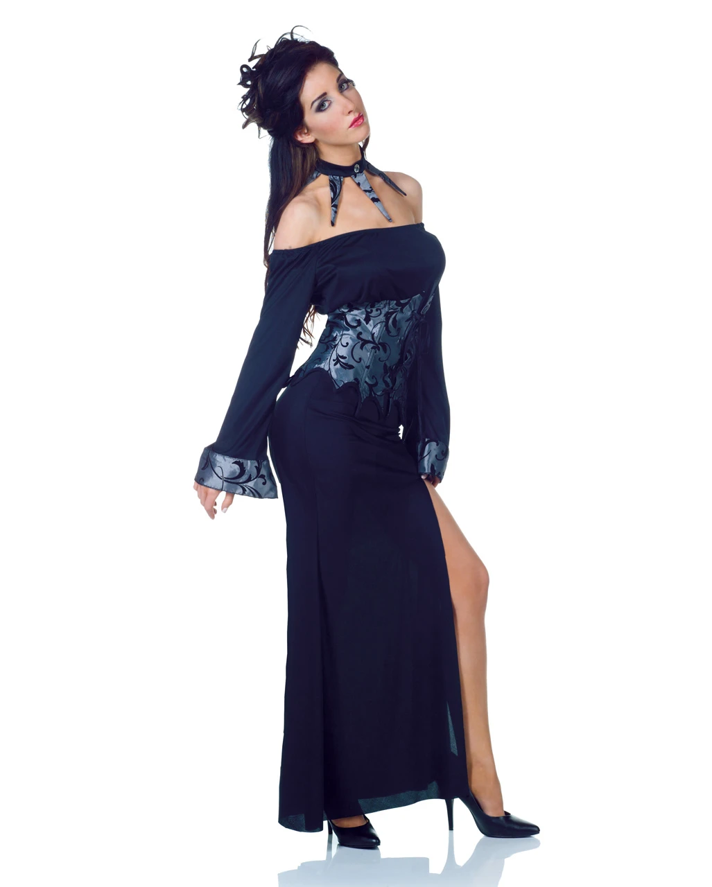 Das Hellseherin Kostüm besteht aus einem bodenlangen Kleid, einem Taillenmieder und einem hübschen Kropfband. Das elegante Kleid aus schwarzem Satin hat einen eleganten Beinschlitz. Der Oberkörper wird durch die schulterfreien Ärmel und das silberfarbene Taillenmieder sehr schön betont. Die Ärmel des Wahrsagerin Kostüms schließen mit dem gleichen Stoff ab, aus dem das Mieder gefertigt ist. Für den passenden Schmuck sorgt das schwarze Kropfband, das von mehreren Strahlen verziert wird. Für die passenden, geheimnisvollen Augen sorgen die Lightening Motivlinsen in Kombination mit den Lange schwarze Wimpern.