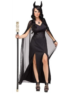 Das atemberaubende Kostüm Set besteht aus einem figurbetonten Kleid mit raffiniertem beinfreiem Schnitt, einem Gürtel, der Deine Taille betont, einem sexy Umhang und natürlich den beeindruckenden Hörnern. Passend dazu empfehlen wir der dunklen Prinzessin das Totenkopfzepter und die Schwarze Hexe Langhaarperücke