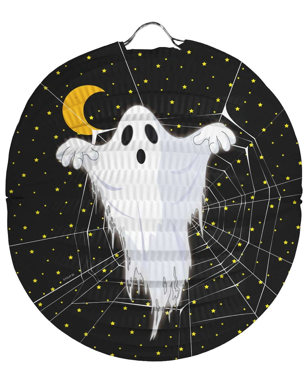 Laterne Gespenst 22cm ist aus festem Papier und ca 22cm groß. An der Oberseite befindet sich eine Öse zum Aufhängen. Das Motiv zeigt ein kleines Gespenst am Nachthimmel, Sterne, Spinnweben und einen Halbmond. Mit dieser Halloween Deko hast du eine Laterne gefunden, an der sich auch Kinder erfreuen werden. Hierzu passt Fledermaus Lampion Rund 22cm. Auch unsere Aufhängbare Hexengeist Deko ist eine coole Party-Deko für Halloween.