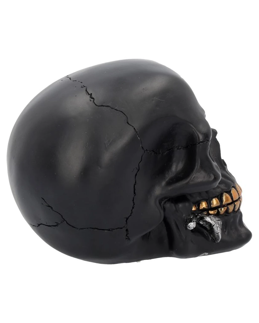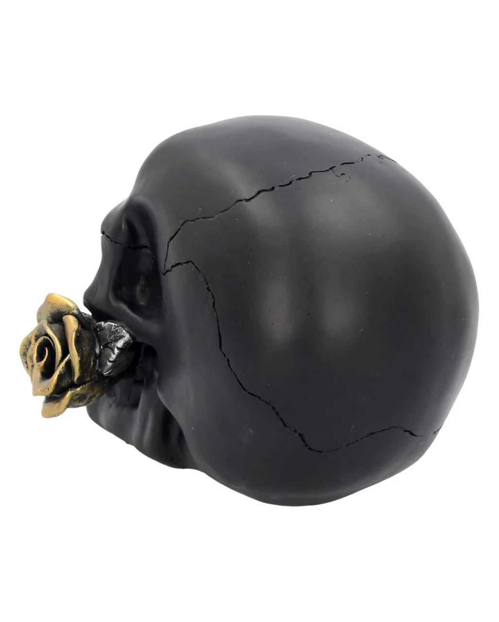 Unser rabenschwarzer Totenschädel besitzt goldene Zähne und eine dazwischen eingeklemmte goldene Rose. Die morbid düsterer Romantik, die der Totenkopf als Thema hat, wird immer wieder gerne als Gothic-Wohnaccessoire bestellt.