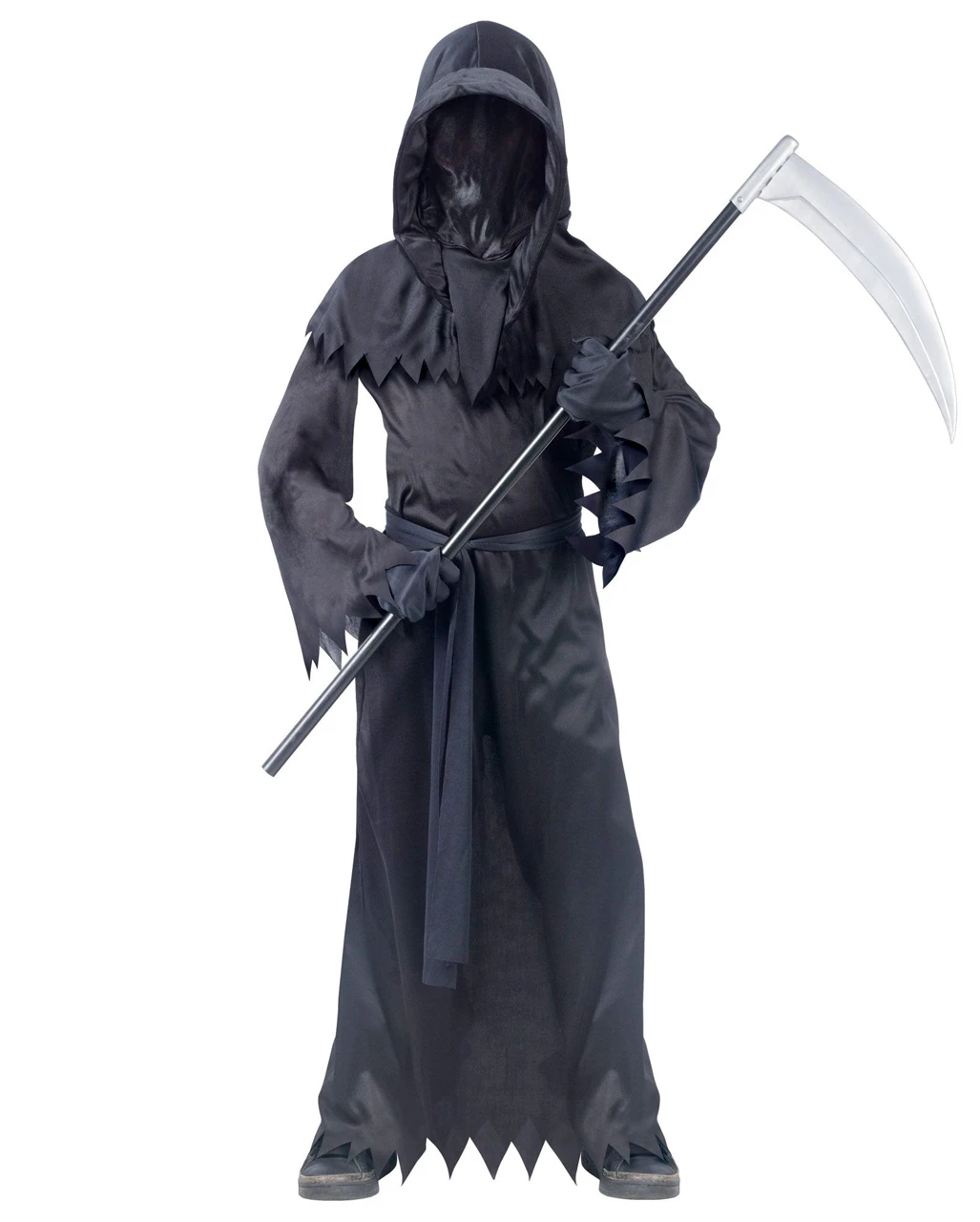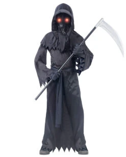 Mit dem Schwarzes Phantom Kinderkostüm mit Leuchtaugen wirst du zum schwarzen Geist aus der Hölle. Das Grusel Kostüm für Kinder besteht aus einer langen fließenden Robe in Tiefschwarz und einem passenden Gürtel. Dazu ziehst du die schwarzen Handschuhe an, die nicht nur unheimlich aussenhen, sondern auch sehr praktisch sind, weil sie deine Hände warmhalten. Zu guter Letzt werden die Mütze und die Leuchtaugen angezogen. Fertig ist die gruselige Halloween Kinder Verkleidung. Besonders eindrucksvoll wirkt das Kostüm, wenn du die Halloween Sense deluxe in der Hand trägst.