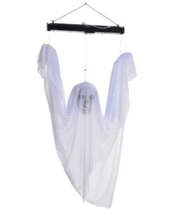 Schwebender Geist mit Schwarzlicht ist eine Hängedekoration für Halloween. Die UV Halloween Deko ist ca 120 cm groß und funktioniert mit Batterien, die du separat dazu kaufen kannst. Das Deko Gespenst hängt an einem Gestell und reagiert auf Sounds und Bewegungen. Der Geist wird von oben mit UV Licht beleuchtet. Währenddessen schwebt er gruselig auf und ab. Genial, nicht wahr? Noch mehr Halloween Gespenster Deko gibt es in unserem Onlineshop. Auch die unheimlichen Grab Zombie Hände sind ein echter Blickfang.
