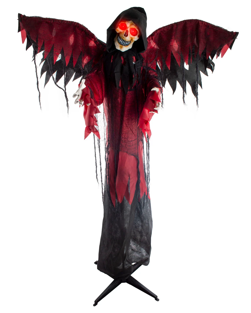 Unser imposanter Sensenmann mit Flügelbewegung, Licht & Sound ist eine Halloween Deko in Lebensgröße. Für Geisterbahn und Privatparty sorgt der Reaper mit leuchtenden Augen und krassem Sound für echte Schocker. Die geflügelte Sensenmann Animatronic für Halloween erwacht zum Leben, sobald sich ihr jemand nähert.