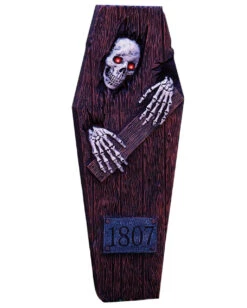 Lieferumfang: 1 x Skelett aus dem Sarg ausbrechend mit LED Augen