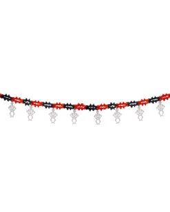 Erst wenn die Skelette an der Decke zum Rhythmus der Musik tanzen, dann ist Halloween! Die Papier-Girlande in den typischen Halloween-Farben Schwarz und Orange setzt bei Deiner Party einen optischen Höhepunkt. Und auch die liebevoll schunkelnden Skelette, die daran baumeln, werden Deine Gäste bestimmt begeistern.