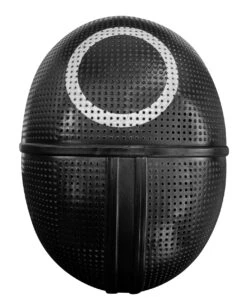 Die Squid Game Maske ist aus schwarzem Kunststoff und besitzt das für sie klassische Viereck. Auf der Rückseite wird die Halbmaske mit einem Gummiband am Kopf gehalten.