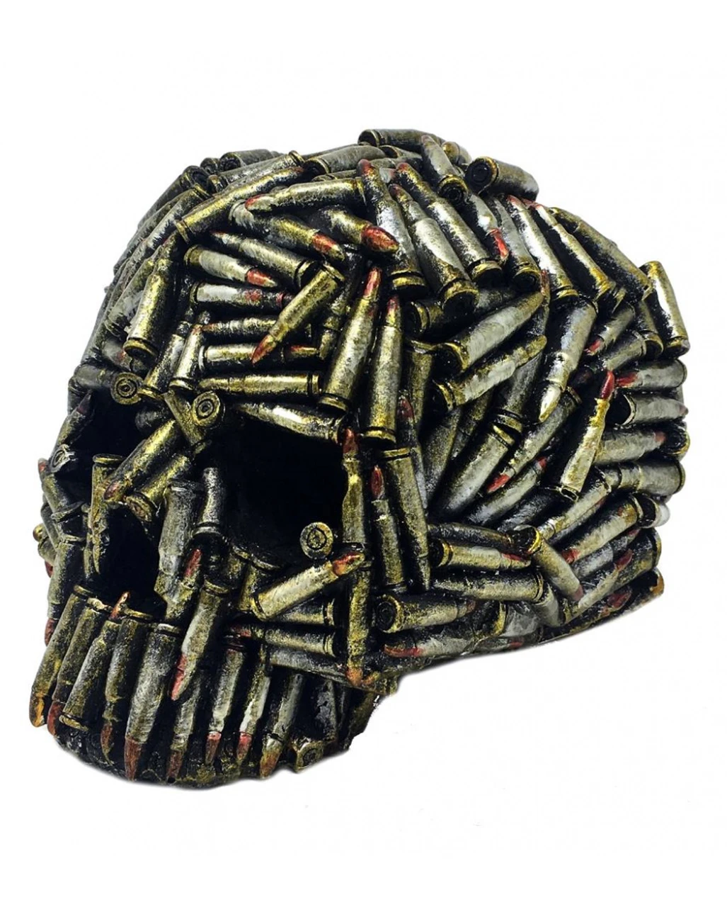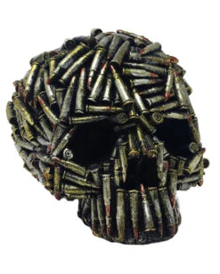 Komplettiere deine Sammlung an stylischen Totenköpfen mit unserem Totenschädel mit Patronenhülsen! Der realistisch aussehende Skull mit unzähligen Projektilen in verwitterter Optik stellt einen absoluten Hingucker und eine schaurige Deko für Halloween und Grusel Partys dar!