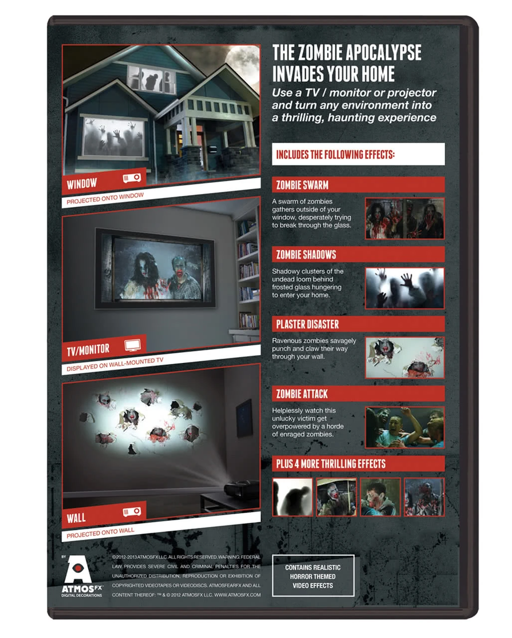 Erlebe mit der Zombie Apocalypse TV Halloween Effekt DVD von AtmosFEARfx, wie grauenhafte Zombies versuchen durch Wände und Türen zu gelangen, dich im Schwarm zu verfolgen. Die blutrünstige Horde versucht alles, um dich zu attackieren und damit an Frischfleich zu gelangen. Die Halloween Effekt DVD beinhaltet 4 verschiedene Szenen mit Sound, plus 4 Bonus Spezial Effeket und lassen sich am besten mit Beamer an Wände, Decken und Fenster projizieren, lassen sich aber auch prima am Fernseher oder Monitor zeigen. Die Möglichkeiten die Zombie Apokalypse TV Halloween Effekt DVD einzusetzen sind fast unbegrenzt. Verschiedene Einstellmöglichkeiten lassen die Halloween DVD in unterschiedlichen Versionen laufen, als durchlaufender Loop oder ein einzeln angewähltes Motiv als Dauerschlaufe. Der Beamer kann dabei horizontal oder vertikal angebracht werden. Extrem coole Idee für deine nächste Halloween Party! Weitere Halloween Effekt DVD Ideen wären dann noch Geister Erscheinung und die Untoten Portraits.